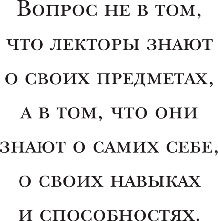 Тот же подход можно увидеть и в проводимых нами мастер-классах для тренеров. Один из самых важных аспектов программы состоит в том, что сначала тренер должен узнать себя как следует, то есть вопрос не в том, что лекторы знают о своих предметах, а в том, что они знают о самих себе, о своих навыках и способностях. Невозможно анализировать других, не проанализировав в первую очередь себя, иначе ты будешь оценивать других людей по своим стандартам, вместо того чтобы оценивать по их. Нужно достичь такого этапа в образовании, когда ты можешь выйти за рамки своих представлений, чтобы оценить другого человека вместо того, чтобы судить, опираясь за свой собственный опыт. Студенту это мало помогает: это твой опыт, а не его. Атлет играет первостепенную роль, но проблемы проступают, когда учителя смотрят на вещи с совершенно другой точки зрения.