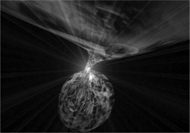 «Солнце, — размышлял Тесла, — это раскаленное тело, несущее огромный заряд электричества и испускающее потоки мельчайших частиц, каждая из которых обладает гигантской энергией благодаря своей огромной скорости. Извергая потоки энергии в космос, солнце должно как-то деформировать эфирную оболочку Земли, заряжая ее всплесками электрической энергии».