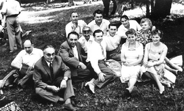 Министр культуры СССР Е.А. Фурцева (2-я справа) и киноактеры Н.Н. Рыбников, С.Ф. Бондарчук, В.В. Тихонов, Н.В. Мордюкова, А.Д. Ларионова, И.К. Скобцева на загородной даче во время встречи руководителей партии и правительства с деятелями культуры и искусства. Июль 1960 г.