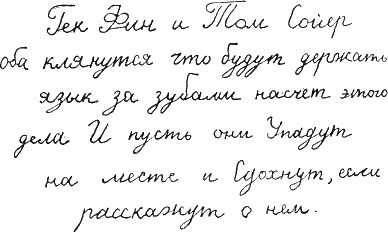 Том всей душой одобрил эту мысль. Она была и таинственна, и мрачна, и страшна, и вполне гармонировала со всеми событиями, с окружающей обстановкой, с ночной порой. Он поднял с полу чистую сосновую дощечку, блестевшую в лунном свете, вытащил из кармана кусок «красной охры», сел так, чтоб свет падал на дощечку, и с трудом нацарапал следующие строки, причем каждой черточке, которая шла сверху вниз, он помогал языком, зажимая его между зубами и отпуская его при каждой черточке, которая шла снизу вверх: