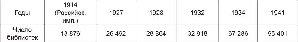 Это была качественная картина новой России, начинающей восхождение к высотам культуры. А вот небольшая количественная иллюстрация – данные по росту числа библиотек в СССР (без изб-читален):