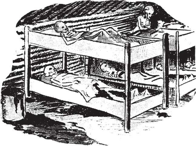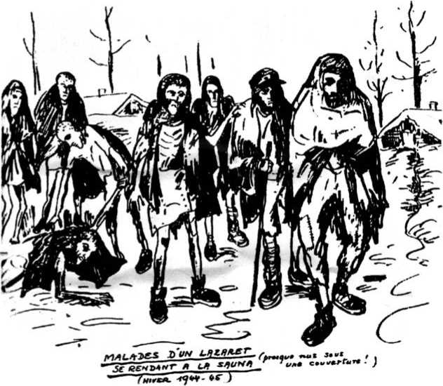 Тяжелобольные, неспособные залезть наверх, занимали нижние места, тогда как менее серьёзные больные должны были карабкаться на верхние койки. Под нижними кроватями стояли большие консервные банки или старые котелки, служившие ночными горшками для больных, неспособных передвигаться самостоятельно. По краям барака было два прохода с земляным полом, ведущих к двум входам в лазарет. Около одного из них небольшой угол, завешанный одеялами, служил спальней и санитарам, и врачу, молодому студенту медицинского факультета из Страсбурга. Около другой двери находился ещё один отгороженный одеялами угол — там возвышался огромный бак, такой же как те, в которых разносили кофе или суп, служивший туалетом и распространявший по всему бараку тошнотворную вонь.