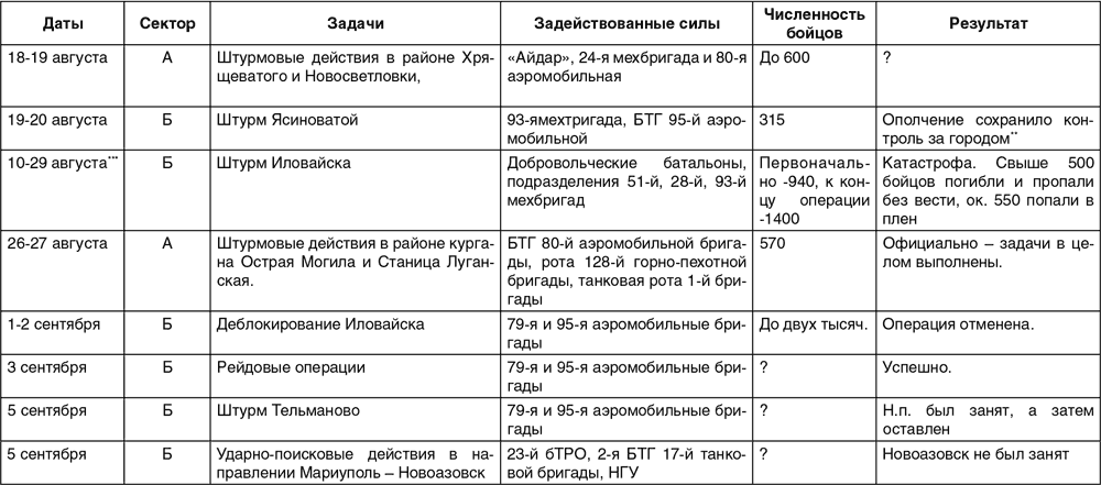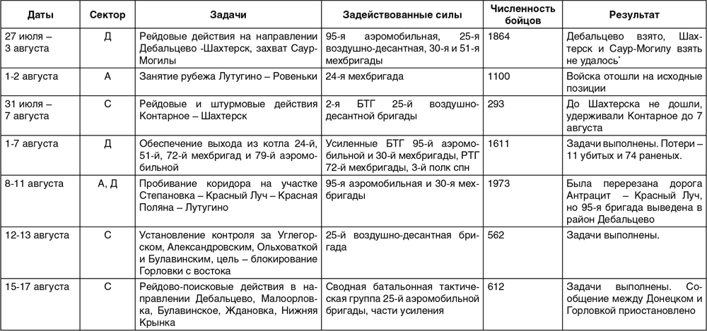 Таблица 2. Операции ВСУ в конце июля – начале сентября 2014 г.