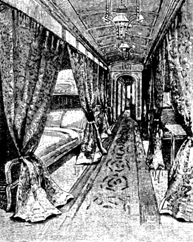Пульмановские вагоны отличаются поразительною роскошью отделки: везде полированное красное или палисандровое дерево, позолота и зеркала. В мужском курительном отделении диваны обиты тисненою кожею, к стенам приделаны не только пепельницы, но и спичечницы, а полы мозаичные. Дамские отделения представляют роскошные будуары, в которых диваны обиты шелком, а шелковые занавески отделаны даже кружевами. Как при мужской курительной, так и при дамской комнатах имеются отдельные помещения с роскошными умывальниками, снабженными в изобилии мылом, полотенцами, гребенками, головными и платяными щетками и т. д. Что касается среднего, наибольшего помещения спального вагона, то днем это обыкновенный изящный первоклассный вагон с диванчиками по сторонам широкого среднего прохода; ночью же диванчики сдвигаются, на них кладутся матрацы и устраиваются великолепные постели, причём каждая постель отделяется от смежных деревянными, на ночь вставляемыми пер городками, а от прохода — тяжелыми шерстяными занавесями, за которыми каждый имеет совершенно изолированное от соседей помещение. Матрацы, подушки, одеяла, постельное белье и т. д. хранятся днем в особых шкафах, по концам вагона. Кроме всего этого, на ночь подвешивается к стене особая сетка, куда можно сложить платье, белье и пр., а в окна, по желанию, вставляются рамы с тонкою металлическою сеткой; эти сетки не пропускают пыли и избавляют от духоты, при здешней жаре иногда нестерпимой. Замечу кстати, что днем, когда окна подняты (в Америке окна в вагонах, как и в домах, поднимаются вверх), с наветренной стороны приставляются особые щиты, избавляющие сидящих от ветра и пыли.