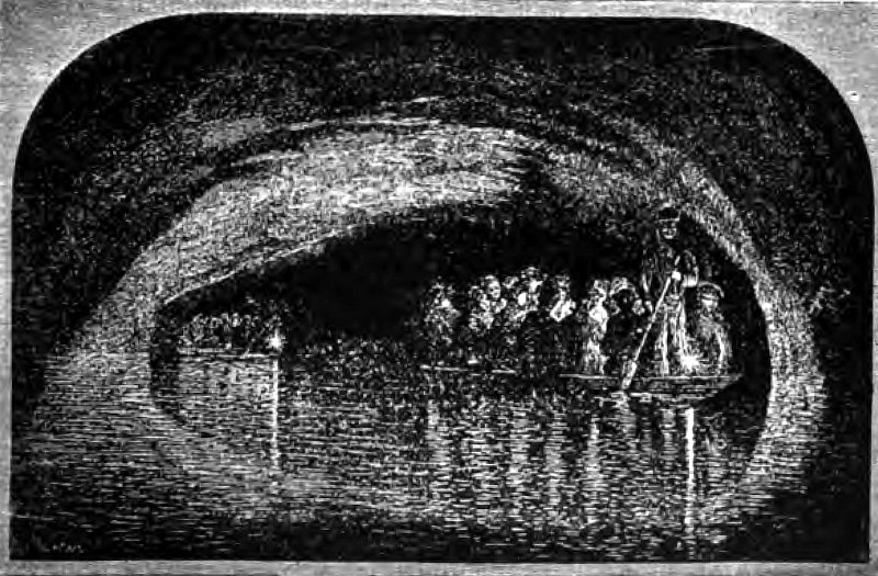 Постепенно спускаясь, мы подошли наконец и к самой воде; узкие берега реки — не голый камень, а песок, весьма нежный и образованный, вероятно, отложениями самой реки. Пройдя около ста саженей по берегу, мы снова начали подниматься и вошли в баковую галерею; река же скрывается в невидимую подземную трубу. Оригинальность и мрачность этих мест напоминают известный рассказ Жюля Верна о путешествии к центру земли. Через несколько минут мы опять идем по карнизу и видим под собою воду: это — озеро Леты, составляющее, в сущности, продолжение реки Стикс. Тут мы снова спустились к воде, но на этот раз уже не заметили никакого бокового выхода. Проводник объявил, что идти дальше сухим путем нельзя, и это озеро надлежит переплыть в лодке. Действительно, мы вскоре увидали и лодку, которая сперва не была заметна частью вследствие темноты, а частью потому, что цвет её ничем не отличается от цвета окружающих каменных стен. Лодка не отличается изяществом: это плоскодонная шаланда, какие употребляют на реках для вывозки нечистот. На дне её — вода и грязь. Садиться нужно на борта, обшитые досками. Переезд был не велик, и мы почти тотчас пристали к противоположному берегу, вышли из лодки и вступили в широкую и довольно красивую галерею, называемую большою аллеей (Great Walk).