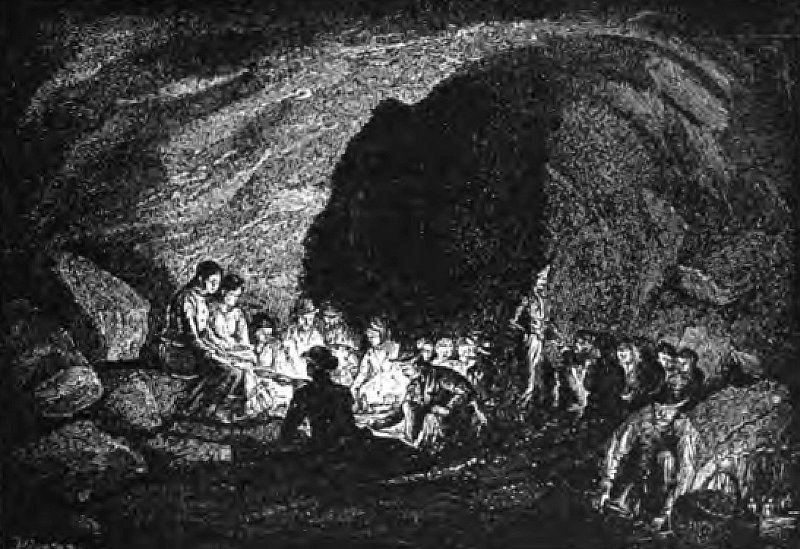 Наконец река окончилась, или, вернее, превратилась в замкнутый канал, недоступный для дальнейшего плавания в лодке. Мы вышли на откос берега, на который проводники вытащили и лодку, и двинулись по узкой, но довольно ровной галерее, называемой Силлимановою (Silliman’s Avenue) в честь профессора Силлимана из Нью-Гевена. Здесь от главного хода имеется множество ответвлений, из которых многие еще вовсе не исследованы. Близ одного из таких ответвлений проводник торжественно провозгласил: «прошу дам остаться здесь, а джентльменов следовать за мной». Оставив дам, мы вошли в боковую ветку, и я никак не мог понять, почему дамы не могли бы идти с нами, ибо, вместо ожидаемого мною крутого и неудобного для женских ног подъема, мы шли по довольно ровной, хотя и весьма извилистой галерее. Секрет вскоре объяснился. Пройдя около 60-ти саженей, проводник остановился и предложил нам оправиться в виду предстоящего подземного обеда. Вернувшись затем к дамам, мы застали их в самом веселом настроении, сидящими на обломках камней и разговаривающими между собою.
