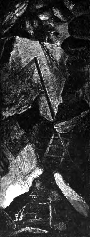 Карабкаясь по камням и частью по упомянутым лестницам, я удивлялся смелости я ловкости наших спутниц. Единственным для них облегчением было только то, что проводник отобрал от них лампы и сам светил в опасных местах, следовательно они могли свободно пользоваться обеими руками. Я со своею лампою не раз падал и изнемогал от усталости, но наконец всё же выбрался и совершенно неожиданно увидал себя под самым потолком свода главной пещеры — Бродвея. Отсюда по стене вырублена довольно сносная лестница, по которой мы постепенно и спустились на пол галереи, недалеко от Ротонды с колодцами для добывания селитры.