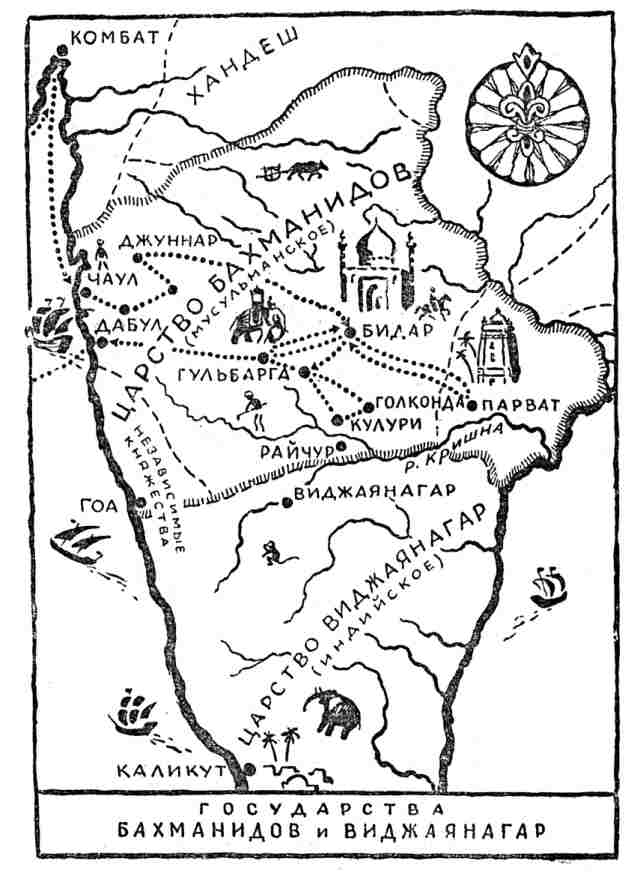 Четыре месяца провел Никитин в Бидаре. Это большой город, в центре Декана (южная часть Индии), на высоте 700 метров над уровнем моря. В те времена Бидар принадлежал мусульманской династии Бахманидов, был столичным городом и славился своими шелковыми тканями, металлическими изделиями и драгоценными камнями. Алмазы из Декана доходили до Европы. Особенной известностью, как источник драгоценных камней, пользовалась Голконда.