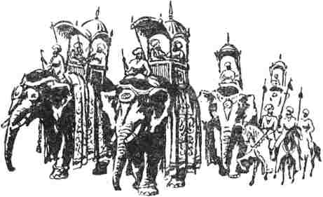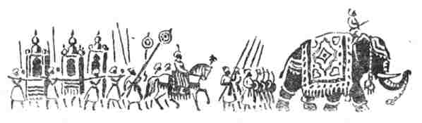 Музыканты, певцы, плясуны, даже фокусники были, говорит Минаев, необходимыми участниками пышного выезда индийского властелина. Процессия обычно двигалась не среди торжественной тишины, а сопровождалась оглушительным шумом певцов, трубачей, барабанщиков, конским топотом, ревом слонов и диких зверей.