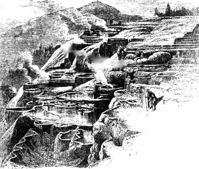 В сущности, это обыкновенная гора, по склонам которой расположены минеральные источники с известковою водой. В продолжение тысячелетий отложения углекислого кальция образовали систему бассейнов, стенки которых представляют снаружи ряды сросшихся сталактитов, окрашенных в самые разнообразные оттенки красного, желтого и голубоватого цветов. Все бассейны, диаметр которых от 1 фута до 20 саженей, наполнены до самых краев горячею водою, которая медленно прибывает из каналов на дне, изливается наружу, переходить в нижележащие бассейны и образует упомянутые сталактиты. Хотя собственно горячих ключей насчитывается тут не более 50-ти, но бассейнов всевозможных размеров и цветов тут бесчисленное множество. Верхние, и вообще бассейны с источником на дне, наполнены кипятком, и из них валит пар, а нижние, или, так сказать, бассейны второго и высших порядков, наполнены водою более или менее охлажденною. Прозрачность воды удивительная и отдает большею частью небесно-голубым цветом. В ней с поразительною ясностью отражается небо со всеми облаками. Красоте зрелища способствует еще и то, что во всех бассейнах вода не стоячая, а медленно текущая, переливающаяся за плоские ровные края и находящаяся в постоянной вибрации. Вместе с тем самое дно этих мелких бассейнов видно с замечательною отчетливостью, а оно представляет те же углекальциевые отложения самых разнообразных и причудливых рисунков в виде рубчиков, концентрических кругов и т. п. Рисунки эти так красивы и оригинальны, а вместе с тем так необыкновенны, что едва ли возможно передать их резцом или кистью. Наружные стенки бассейнов кажутся чрезвычайно правильными, гофрированными и плотно прижатыми друг к другу колонками. Высота их весьма различна, от нескольких дюймов до 2–3 саженей. Стенки, конечно, чрезвычайно чисты, потому что они непрерывно смачиваются медленно текущею по ним водою. Влажный вид придает им характер льда или леденцов, по крайней мере, вблизи; издали же, как я заметил уже выше, отдельные бассейны кажутся снизу замерзшими каскадами, а сверху поставленными друг на друга фарфоровыми блюдами, наполненными снятым молоком, или, наконец, напоминают какое-то гигантское и затейливое произведение кондитерского искусства.