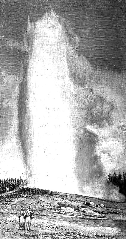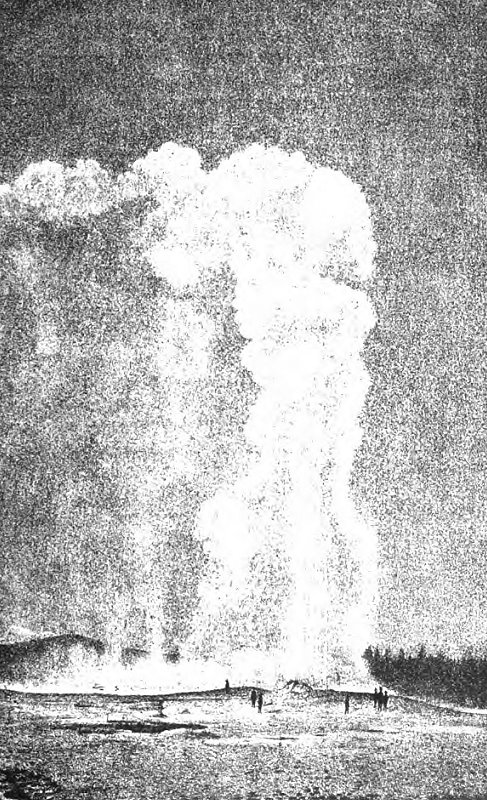 Прежде всего я направился к ближайшему к гостинице гейзеру Старый Друг (Old Faithful). Его извержения совершаются с удивительною правильностью каждые 65 минут. Это не маленький гейзер, вроде виденных мною в бассейне Норриса, но огромный: высота его фонтана превосходит 20 саженей. Этот гейзер — любимец туристов: день и ночь, зиму и лето он без перерывов дает свои бесплатные представления. Он расположен в самой южной части Верхнего бассейна, на довольно возвышенном гейзеритовом холме, с которого открывается хороший вид и на все прочие гейзеры. Он не имеет водоема, а на вершине холма находится неправильное углубление, на дне которого видна кипящая вода. Вскоре после моего прихода из углубления послышались звуки, напоминающие удары грома, а через несколько минут, после ряда небольших фонтанчиков, началось и настоящее извержение, причём столб воды имел около двух футов в диаметре и поднимался на высоту около 20 саж. Смотря по силе и направлению ветра, внешний вид величественного фонтана весьма различен. При мне дул слабый северо-западный ветер, относивший фонтан к юго-востоку. Я стоял во время извержения с наветренной стороны, совершенно невредимо, в пяти шагах от углубления, а Окс успел снять фотографию этого прекрасного гейзера. Извержение продолжалось не более пяти минут, после чего гейзер успокоился, и только на дне углубления по-прежнему клокотала вода.