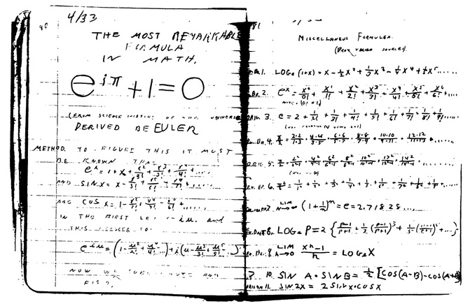 для тангенса (х). Он не чувствовал себя стесненным правилами, но в то же время оставался невероятно методичным. Он запоминал таблицы логарифмов и вычислял значения функций в уме. Его записные книжки заполнялись формулами, а также бесконечными рядами, суммы которых равнялись ? и e.