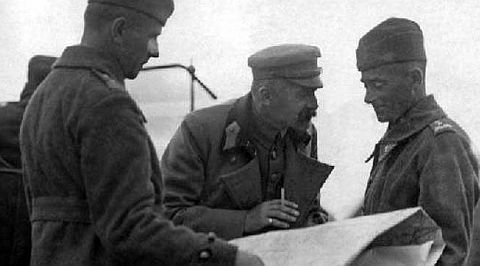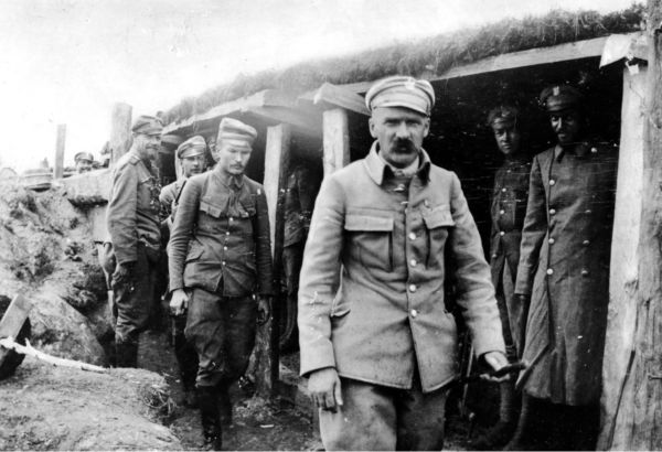 В окопах 4-го пехотного полка Легионов. Район Рудка Мыринска на Волыни. Сентябрь 1916 года. За Юзефом Пилсудским — Альбин Флешар и Болеслав Венява Длугошовский.