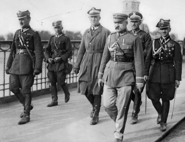 На мосту Понятовского. 12 мая 1926 года. На первом плане (слева направо): подполковник Казимеж Стамировский, поручик Зебровский, генерал Густав Орлич-Дрешер, Юзеф Пилсудский, майор Влодзимеж Ярошевич, поручик М. Галиньский.