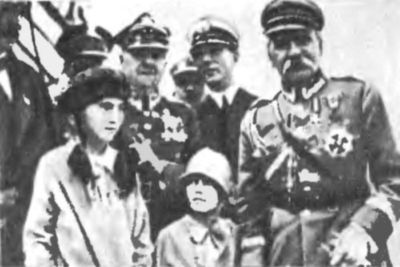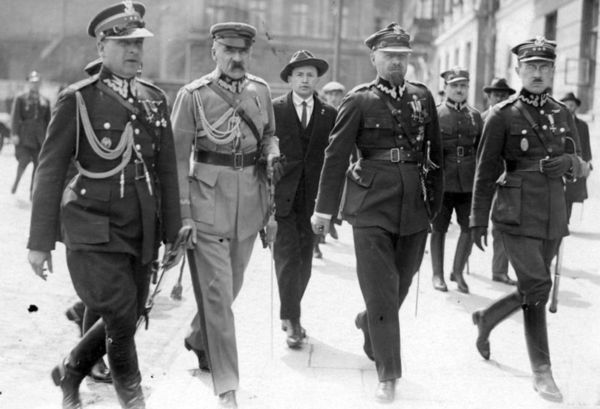 В день президентских выборов 31 мая 1926 года. На первом плане (справа налево): полковник Юлиан Стахевич, майор Александр Прыстор, Юзеф Пилсудский, полковник Болеслав Венява Длугошовский.