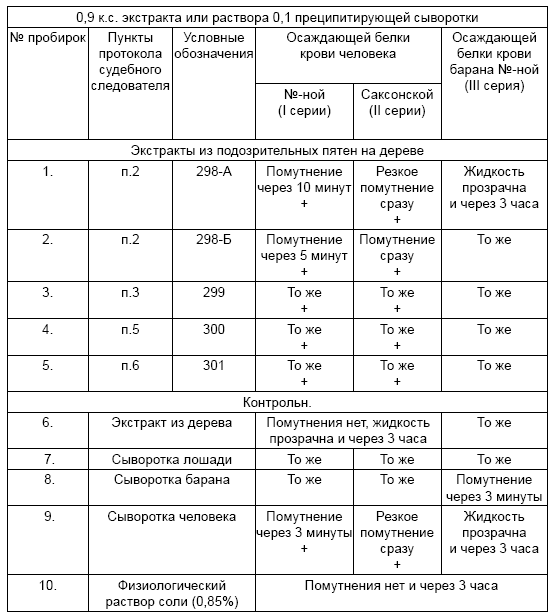 После предварительного испытания сывороток я приступил к исследованию путем реакции преципитации указанных выше описанных в п. 2, 3, 5 и 6 вещественных доказательств.