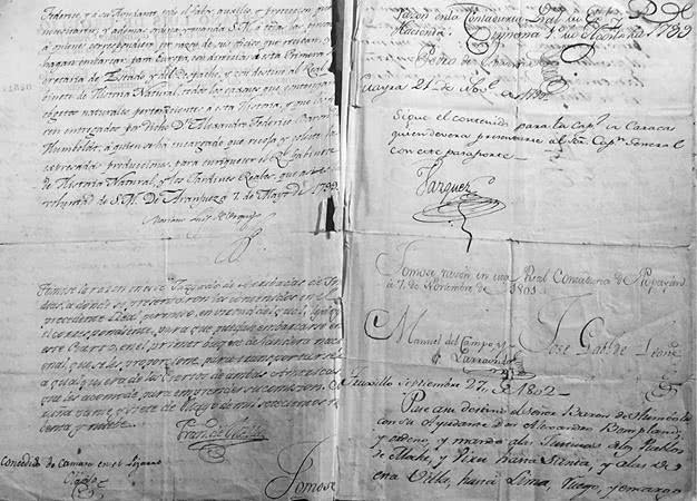 Страницы из испанского паспорта Гумбольдта с подписями нескольких администраторов колоний