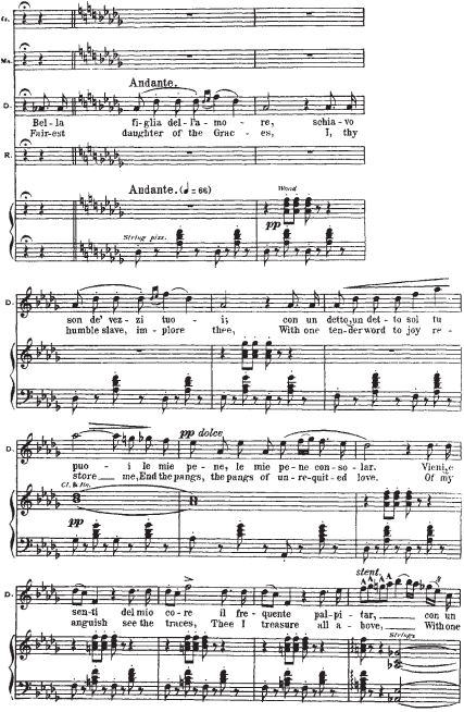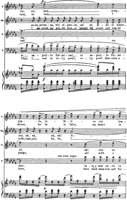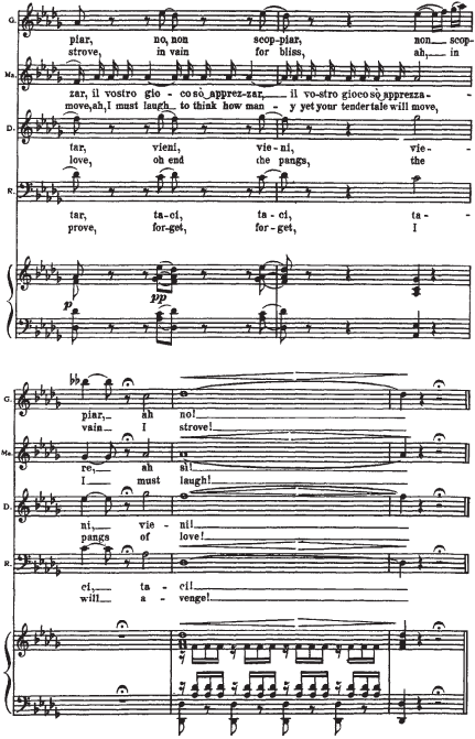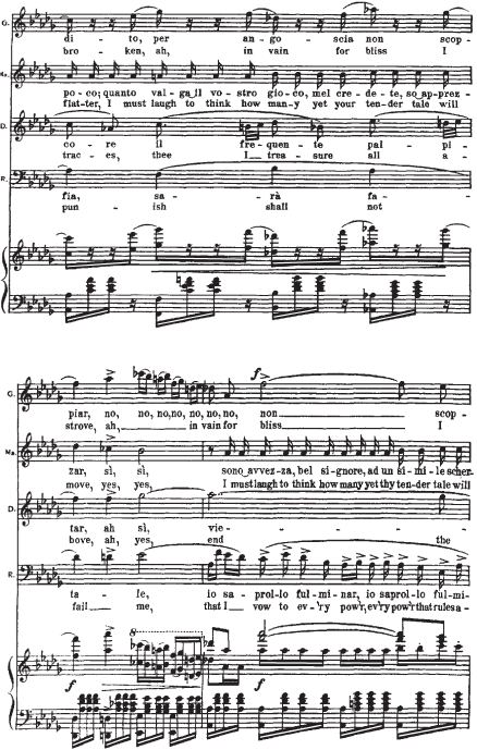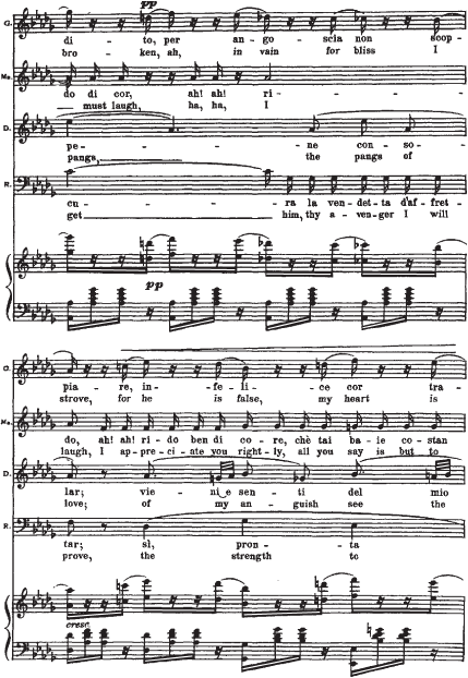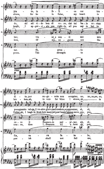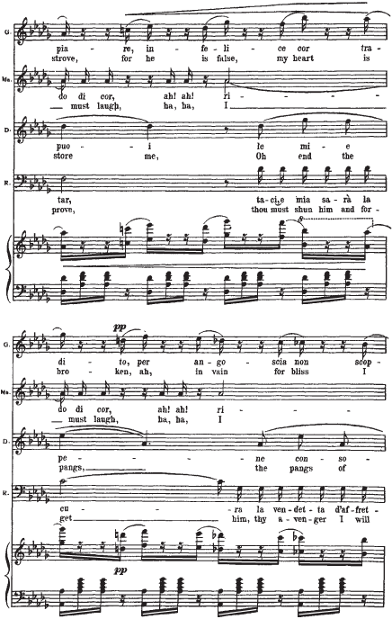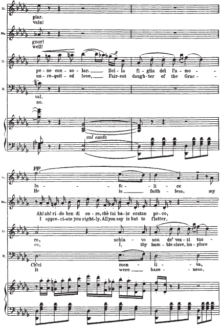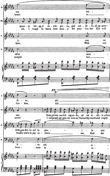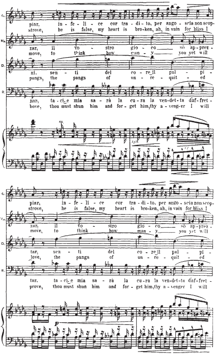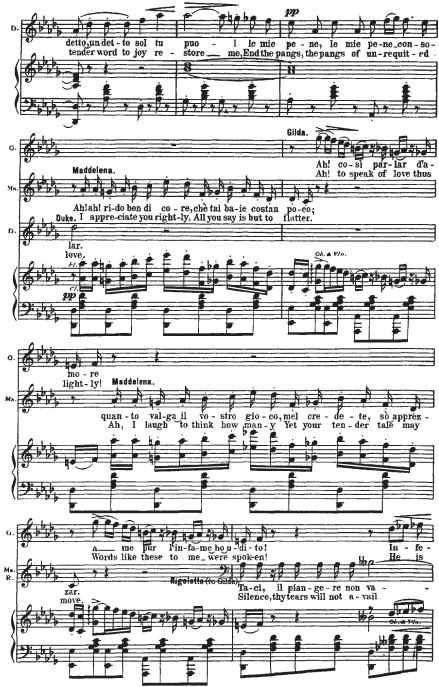 Приводимый нотный пример начинается с мелодии Герцога. Она элегантна (шестнадцатитактный период с форшлагами из двух шестнадцатых к ноте f, портаменто), обольстительна, но в то же время полна скрытой энергии (постоянное стремление в высокую тесситуру). В ответ на ухаживания Герцога следует фраза Маддалены. Звучащая шестнадцать тактов стаккато, она носит характер насмешки, но одновременно и поощрения кавалера. Линия мелодии Джильды, в основном, изломана и разорвана паузами на протяжении двух шестнадцатитактных периодов плюс восемь тактов коды. Она свидетельствует о ее мучительном, противоречивом душевном состоянии. Контрапункт этой мелодической линии составляет тема Риголетто: встревоженный отец пытается «открыть глаза» влюбленной дочери.