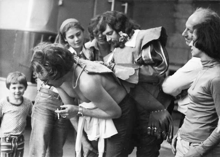 В. Смирнитский в костюме Портоса подписывает джинсовую сумку для Ани Тереховой. На съемках фильма «Д’Артаньян и три мушкетера»