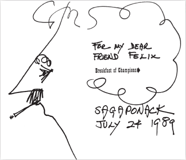 Моему дорогому другу Феликсу. Июль, 24, 1989 г. Автошарж-автограф великого Курта Воннегута. Эту реликвию Феликс хранит до сих пор