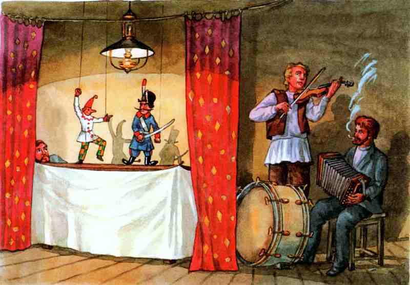 Изба разделена на две неровные половины. На той, что побольше, — зрители на лавках. На другой половине — столик. В столике длинные прорези имеются. По бокам стола — занавески. За ними — скрипач и гармонист. Гармонист не только на гармошке наяривает, но еще и в барабан колотушкой бухать успевает. Наступит ногой на педаль — колотушка и бухнет. Снова наступит — бухнет опять… Гул, смешки, махорка. Вдруг из-за занавесок высовываются руки. И на стол выпрыгивают куклы. Сейчас их будут на проволочках водить!