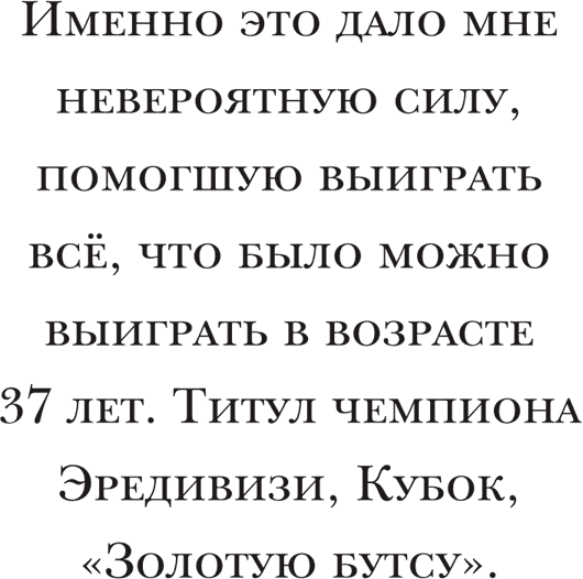 Часто доводилось слышать, что по ходу последних трёх моих сезонов в качестве игрока тренеры зачастую играли декоративную роль в команде, а все решения за них принимал я. Это чепуха. В спорте высочайшего уровня всё работает не так. Я всегда помнил о том, что Курт Линдер следил за тем, чтобы мой мотор не барахлил. Ад де Мос был новым человеком в моей карьере, но и с ним у нас всё шло гладко. Подход Тейса Либгертса в «Фейеноорде» был таким же, как у Линдера. Когда мы бегали по пересечённой местности, он всегда повторял мне, что ему не важно, где я остановлюсь: «Беги со всеми, а там будет видно, сколько сможешь выдержать».