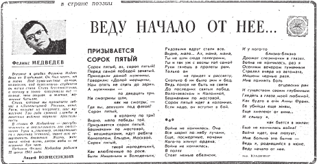 Публикация стихов в газете «Литературная Россия» с предисловием друга. 1966 г.