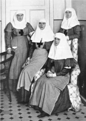 Сёстры милосердия — Александра Фёдоровна вместе со старшими дочерьми Ольгой и Татьяной и Анной Вырубовой.