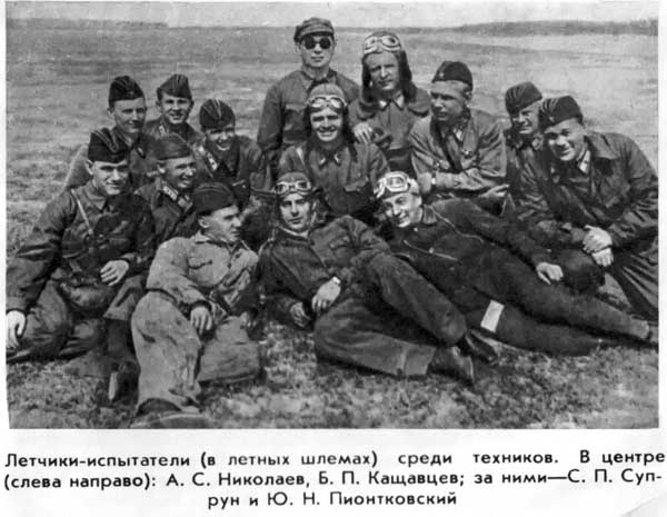 Летчики-испытатели (в летных шлемах) среди техников. В центре (слева направо): А. С. Николаев, Б. П. Кащавцев; за ними — С. П. Супрун и Ю. Н. Пионтковский