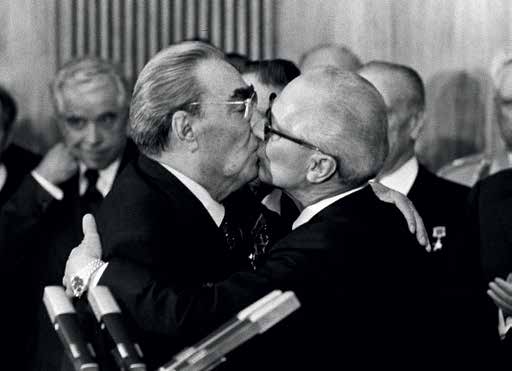 Л. И. Брежнев и Э. Хоннекер. Эта сцена в виде граффити воспроизведена на оставшемся фрагменте Берлинской стены.