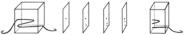 «Представьте, что в куб с коллодием поместили черную нить, после чего коллодий отвердевает, — писал он. — Нить тянется сверху вниз произвольным образом. Затем куб нарезают по горизонтали на тонкие квадратные секции; из этих срезов, как из последовательно сменяющих друг друга кадров, составляют фильм». На каждом таком срезе будет присутствовать точка, и она будет перемещаться, шаг за шагом повторяя траекторию нити. А теперь представьте, объяснял Фейнман, что нить в кубе изогнулась в форме буквы N. Стороннему наблюдателю, который видит только срезы, но не нить целиком, эта картина напомнит образование пары «частица/античастица»: