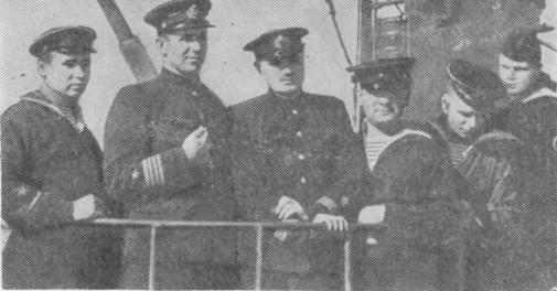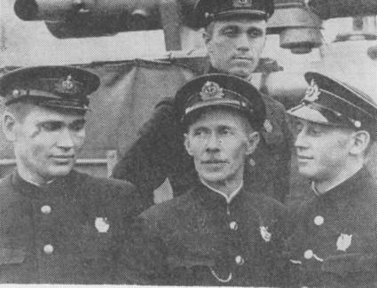 Группа командиров минного заградителя «Ока», награжденных боевыми орденами. Слева направо: С. М. Сизоненко, командир корабля Н. И. Мещерский, К. М. Кононов, Михайлов