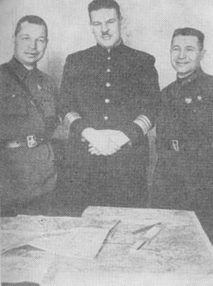 Слева направо: военком штаба флота П. Л. Сидоров, начальник штаба флота Ю. А. Пантелеев, заместитель начальника штаба Ф. В. Зозуля