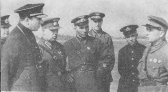 Среди морских летчиков. Рядом с командующим командир авиаполка Е. Н. Преображенский, справа — П. В. Кондратьев