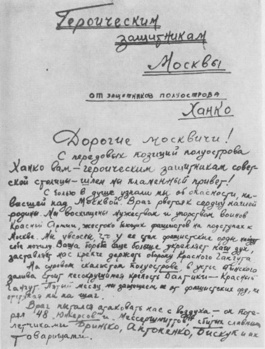 Обращение героических защитников Ханко к защитникам Москвы