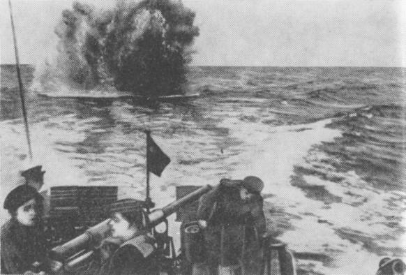 Морской охотник атакует вражескую подводную лодку