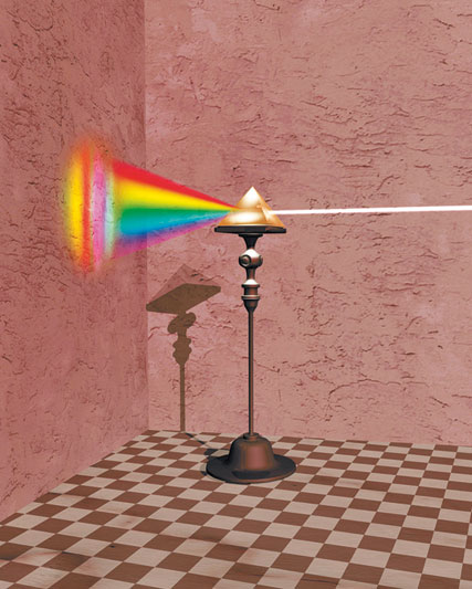 Одно из величайших открытий Ньютона лежит в области оптики. Ньютон обнаружил, что если пропустить солнечный свет сквозь при-зму, он разлагается на составляющие его цвета (спектр) – на цвета радуги.