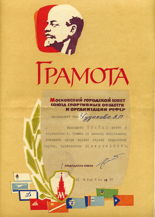 Грамота, полученная А. Чудаковым в первых московских соревнованиях по зимнему плаванию (первое и второе места заняли профессиональные спортсмены – мастера спорта по нескольким видам)