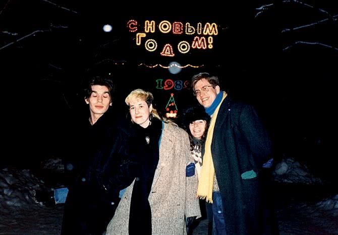 Юрий Каспарян, Джоанна Стингрей и ее лучшая подруга Диана с мужем Джеффри в Ленинграде. Канун Нового года, 31 декабря 1988 г.