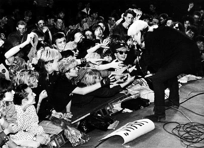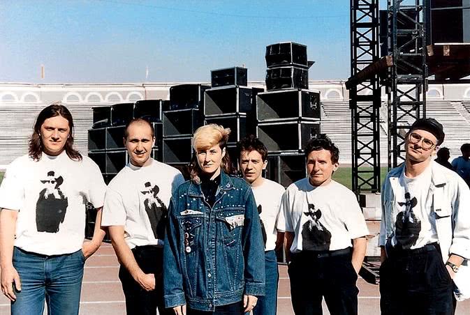Звукорежиссер Евгений Волощук, Андрей Нуждин, Джоанна Стингрей, Игорь Чередник, Гриша Сологуб и Витя Сологуб на концерте в Минске. 1989 г.