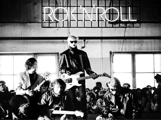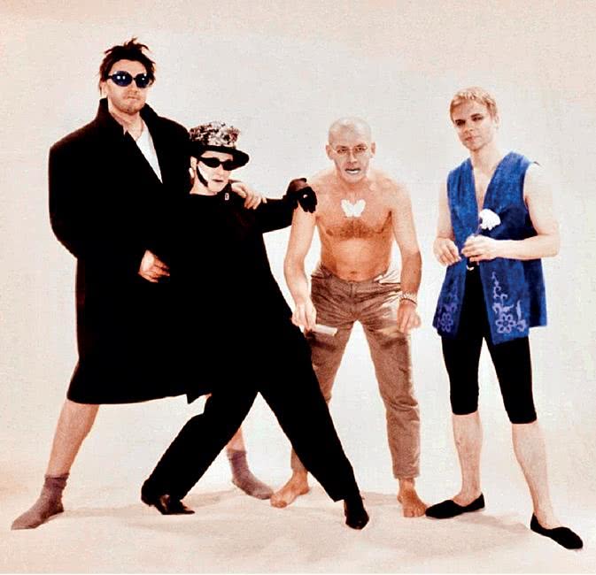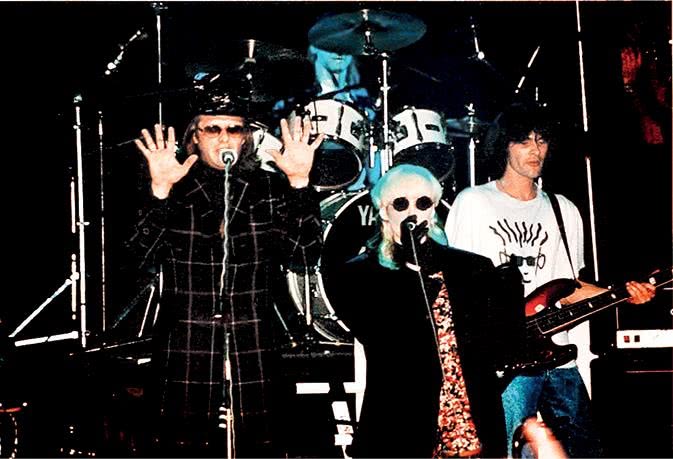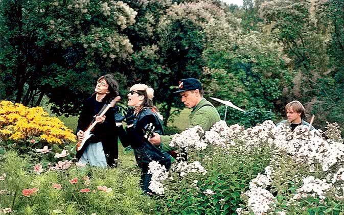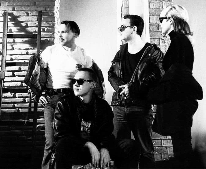 Гарик Сукачев, Саша Скляр, Володя Шахрин и Джоанна Стингрей на съемках клипа «Все это рок-н-ролл». Москва, весна 1992 г.