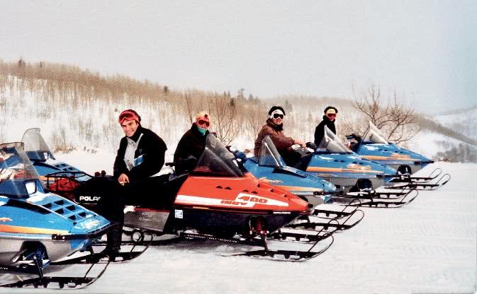 Каспарян, Стингрей, Цой и Наташа Разлогова на снегомобилях в Парк-Сити, штат Юта. Январь 1990 г.