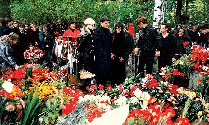 Ирина Каспарян, Джоанна Стингрей, Юрий Каспарян, Наташа Разлогова, Георгий «Густав» Гурьянов, Игорь и Маня Тихомировы у могилы Виктора Цоя. Ленинград, Богословское кладбище, август 1990 г.