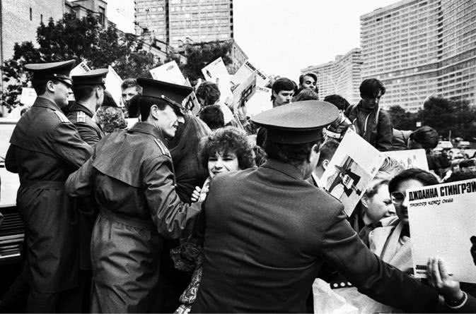 Джоанна Стингрей с группой на съемках видео-клипа «Война». Москва, 1990 г.
