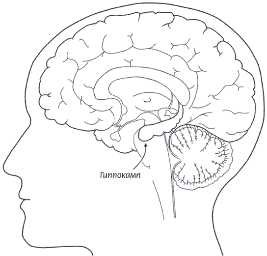 Часть мозга, которую удалили Г.М., чтобы избавить его от эпилепсии, называется гиппокампом (см. рис. 7). Это расположенное в глубине височных долей продолговатое образование в форме сосиски, изгибающееся наподобие хвоста морского конька. Гиппокамп в переводе как раз означает «морской конек».