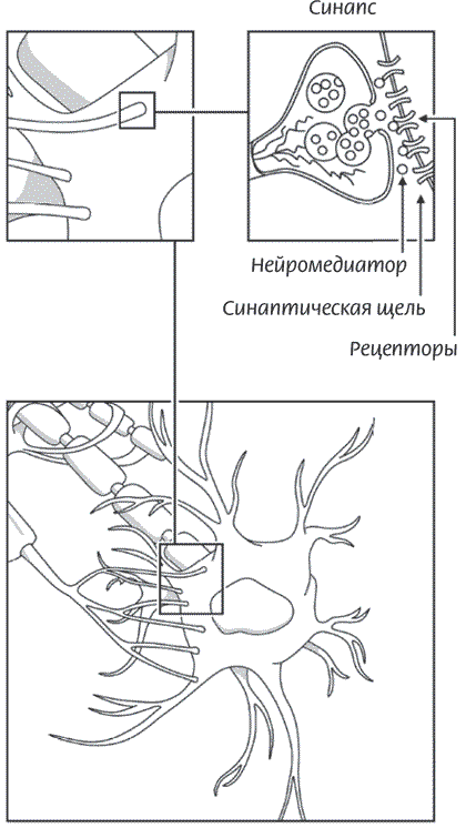 Рисунок 10. На основном изображении вы видите, как отросток одного нейрона соединяется с телом другого нейрона. Место, где передается информация от нейрона к нейрону, называется синапсом, а щель между ними – синаптической щелью. Увеличенные фрагменты даны сверху. Информация переносится нейромедиаторами передающего нейрона, которые попадают на рецепторы принимающего нейрона