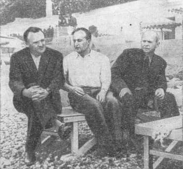 Обсуждение будущих полетов продолжается и на отдыхе у моря. С. П. Королев, Н. П. Каманин, В. И. Яздовский.
