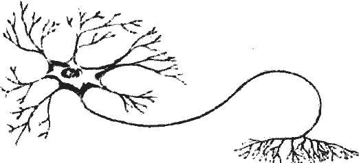 Рис. 3.1. Нейрон. Обратите внимание на тело клетки с хорошо заметным ядром. От тела отходят древовидные дендриты, усеянные мелкими шипиками, и длинный аксон, разделяющийся на конце на веточки, каждая из которых несет синаптическое окончание, контактирующее с дендритами или телами других клеток. Нейроны могут иметь разнообразные размеры и форму, но у них всегда можно различить клеточное тело, дендриты, аксон и синаптические окончания.