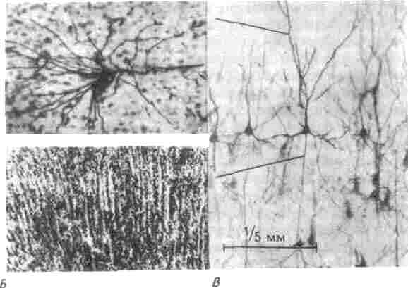 Рис. 3.2. Нейроны головного мозга. Микрофотографии, полученные с помощью светового микроскопа, две из них (А, В) — после окрашивания по методу Гольджи, которое выделяет только некоторые нейроны, но целиком, с клеточными телами, дендритами и аксоном. Темноокрашенные клеточные тела имеют примерно 2-10 мкм в диаметре (1 мкм — это миллионная доля метра).