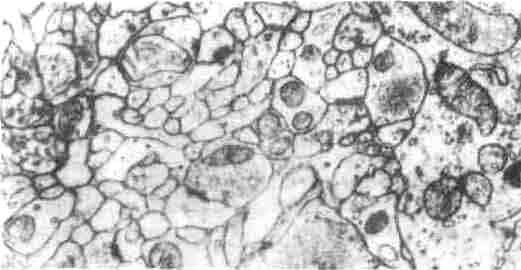 Рис. 3.3. Электронная микрофотография мозговой ткани. На таких препаратах динамичная структура мозга навсегда «заморожена» и предстает в виде запутанной массы нейронов, глии, дендритов, аксонов и синапсов.